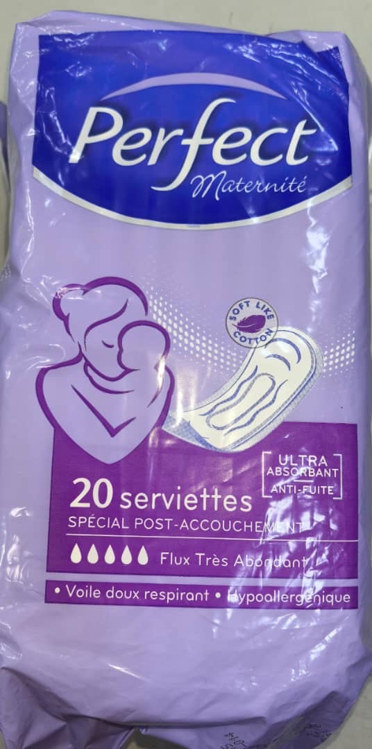 Le produit sur l’image est un paquet de serviettes hygiéniques Perfect Maternité.
